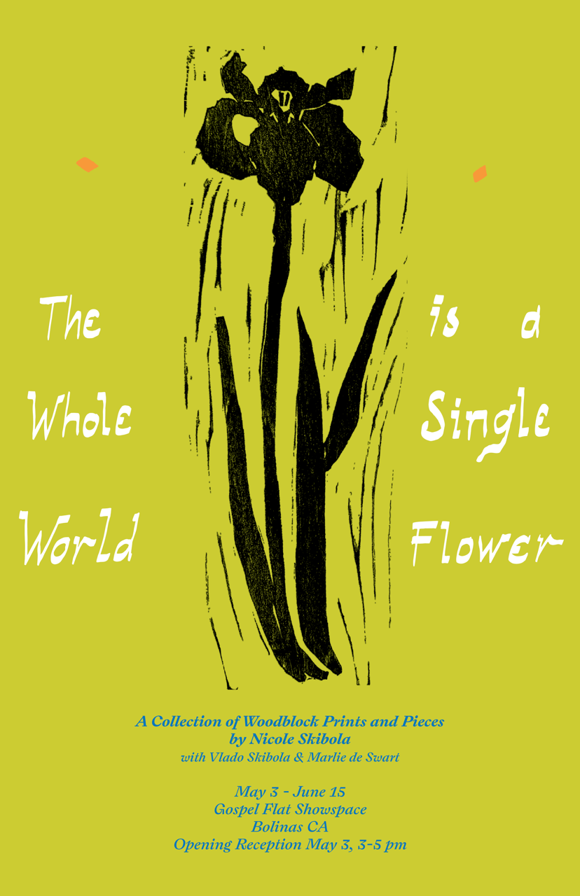 The Whole World is a Single Flower is an exhibition of new woodblock prints made by Bolinas based artist Nicole Skibola. This series of woodblocks are made in the Japanese style of mokuhanga - which follows the tradition of ukiyo, directly translated as “the floating world.” Delicate, water-based prints explore a sense of place and specifically the spirit of place: the moon over a lake before a night swim, the texture of a granite stone from Mt. Tamalpais, the electric first blooms of spring in West Marin. Each work is a collaboration with material and the sensitivity to to a myriad of technical conditions including the imperfections in a handmade piece of kozo paper, the grain of a block of wood or the gentle watery impressions that each amount of pressure leaves behind. Through experiments with depth, softness of line and gradient and texture of color, the images live in a realm between painting and printmaking. Most prints in this show are considered in two distinct color ways and textural explorations - the artist’s reflection of seasons and the elemental experience of the natural world in constant flux in and around us. This show weaves together the emotion of personal experience with collective myth of place and time - an artist’s inquiry into how the natural world and our inner landscapes are in constant dialogue, the boundaries of all things eventually dissolving.
